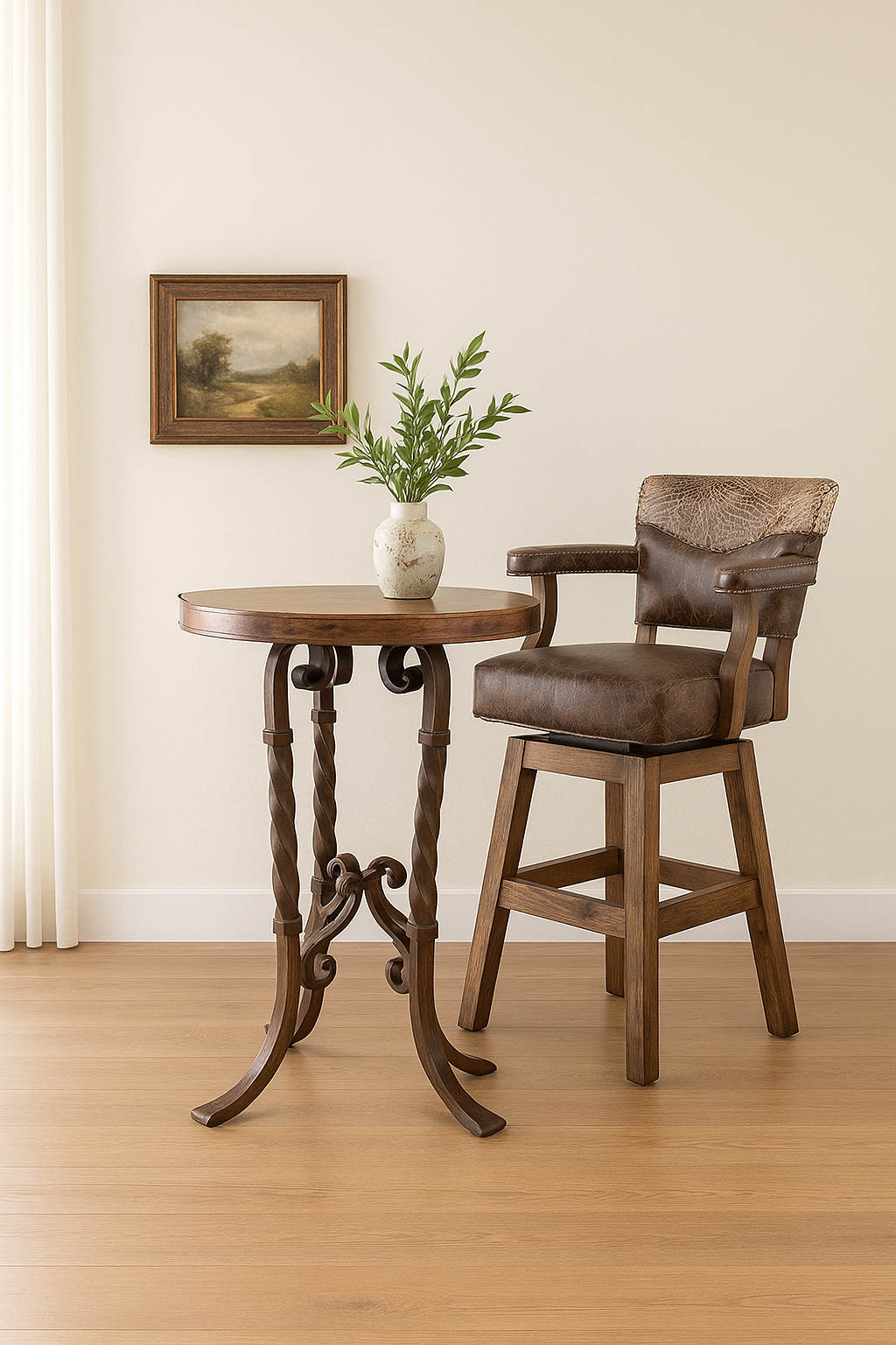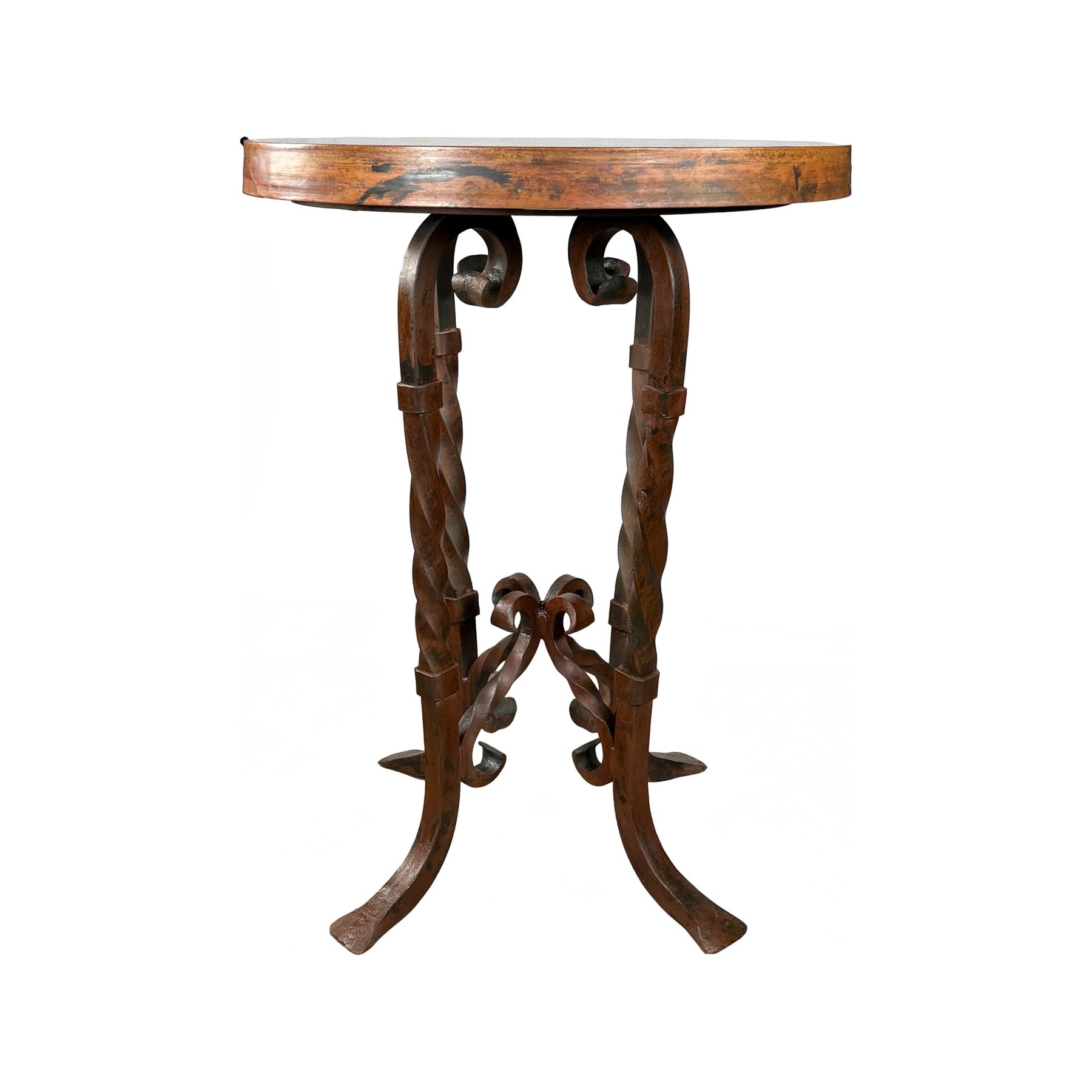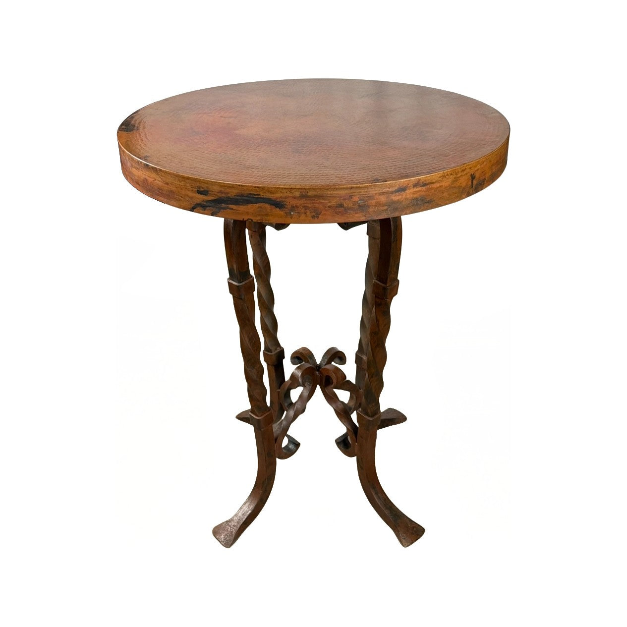 The Copper Top W/ La Villa Iron Base showcases the perfect balance of rugged craftsmanship and refined beauty. The hand-hammered copper top features a warm, natural patina that adds depth and character to any room. Beneath it, the La Villa iron base stands out with intricate twisted legs and scrollwork, offering both elegance and stability. Each piece is handcrafted by skilled artisans, making it a true statement of Western artistry and timeless design. Ideal for dining nooks, bar areas, or as an accent table, this piece brings Hill Country charm to any home.