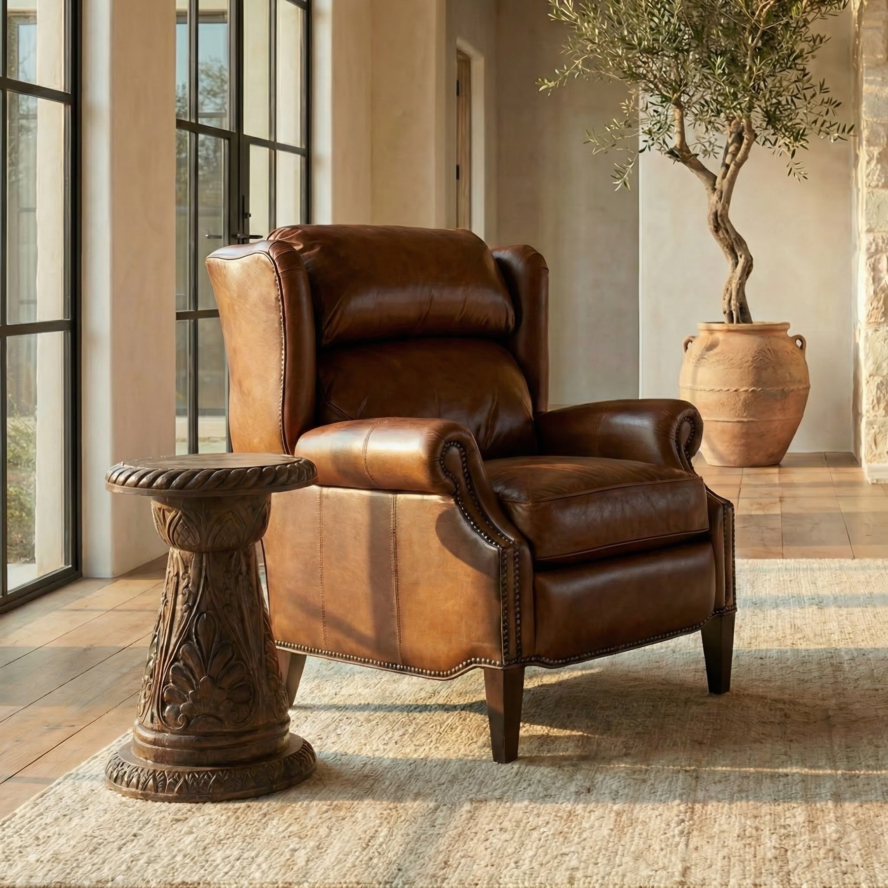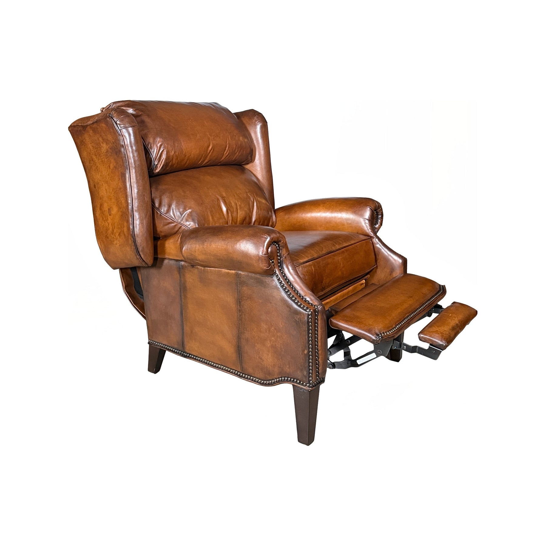 The Prescott Manor Recliner is the perfect blend of timeless design and everyday comfort. Upholstered in rich, hand-finished leather, this recliner showcases warm tonal variation and natural character that only grows more beautiful with age. The generously padded back and seat offer deep, supportive comfort, while gently rolled arms and classic nailhead trim add refined detail.