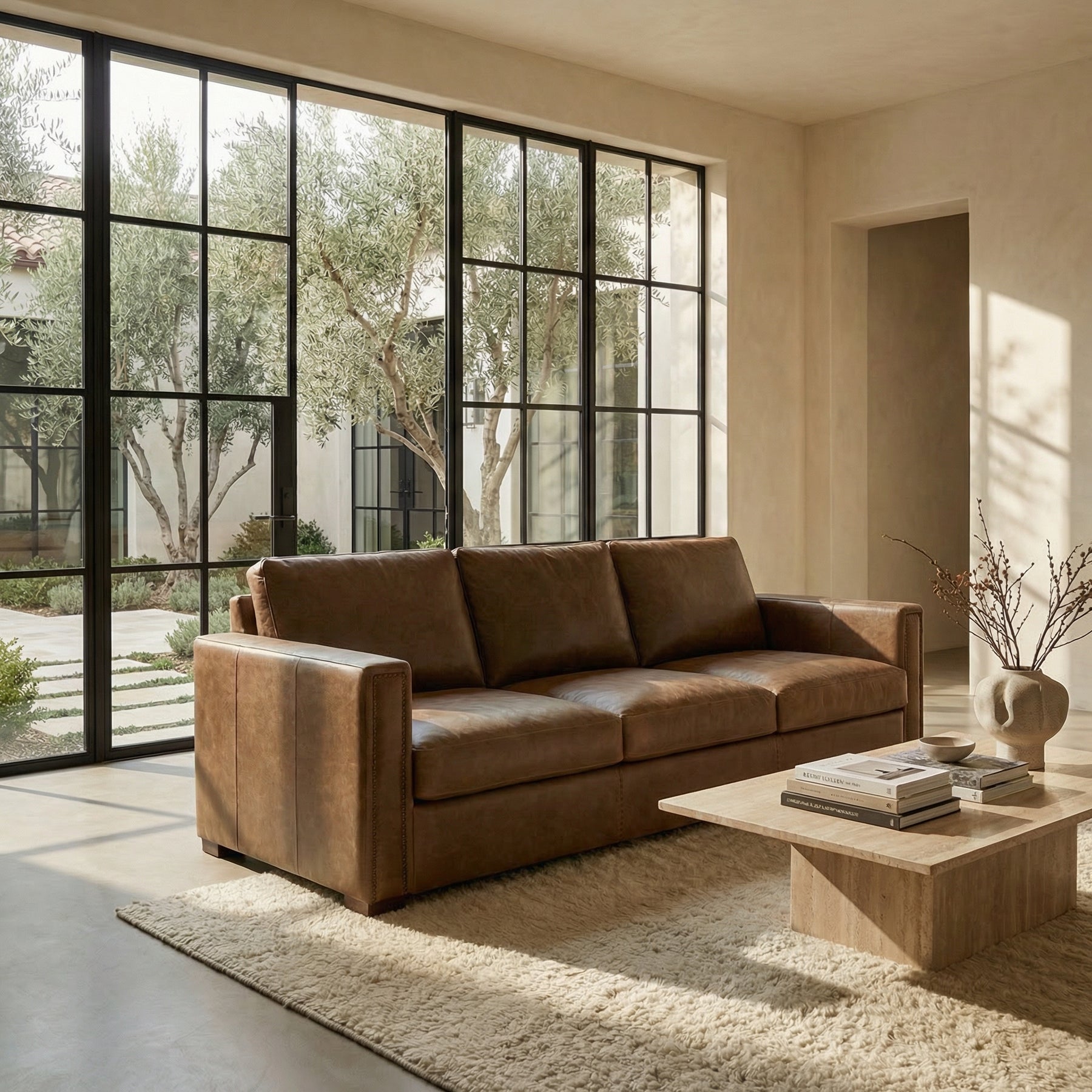 Understated luxury meets rugged simplicity in the Roadster Conversational Sofa — a modern Western piece built for everyday comfort and timeless appeal. Upholstered in hand-finished top-grain leather, this sofa features clean lines, square arms, and oversized cushions for a relaxed, tailored look. A deep seating profile invites you to sink in, while subtle nailhead trim adds just the right touch of Western refinement. Ideal for open-concept homes, lodges, or casual living rooms.