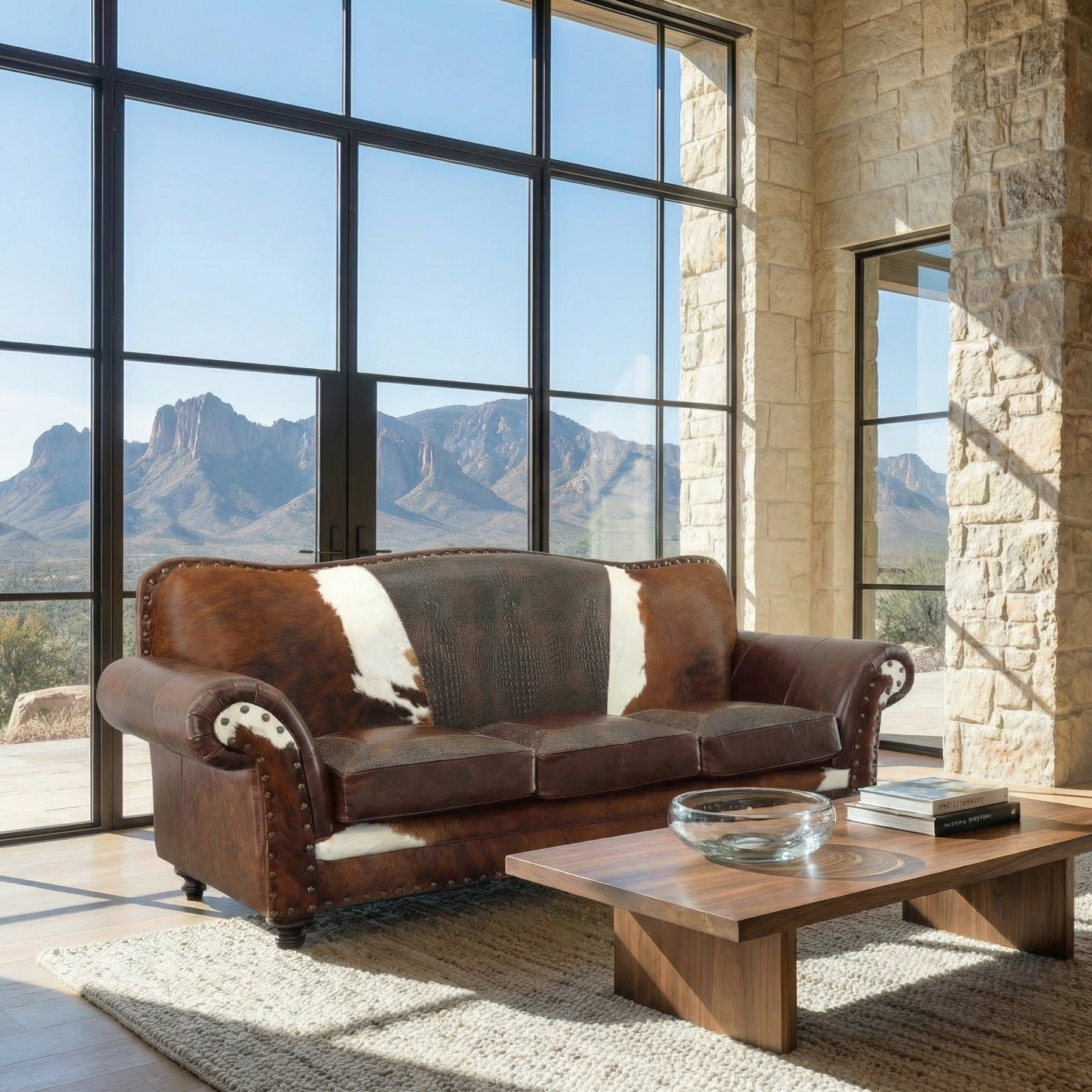 Boldly Western and built for comfort, the Texas II Sofa captures the rugged charm of the frontier with refined craftsmanship. This statement piece features a striking combination of hand-distressed top-grain leather, exotic crocodile-embossed leather, and genuine hair-on-hide panels. The gently curved backrest and rolled arms are finished with oversized brass nail head trim, while plush seat cushions provide support worthy of long conversations and cozy evenings.