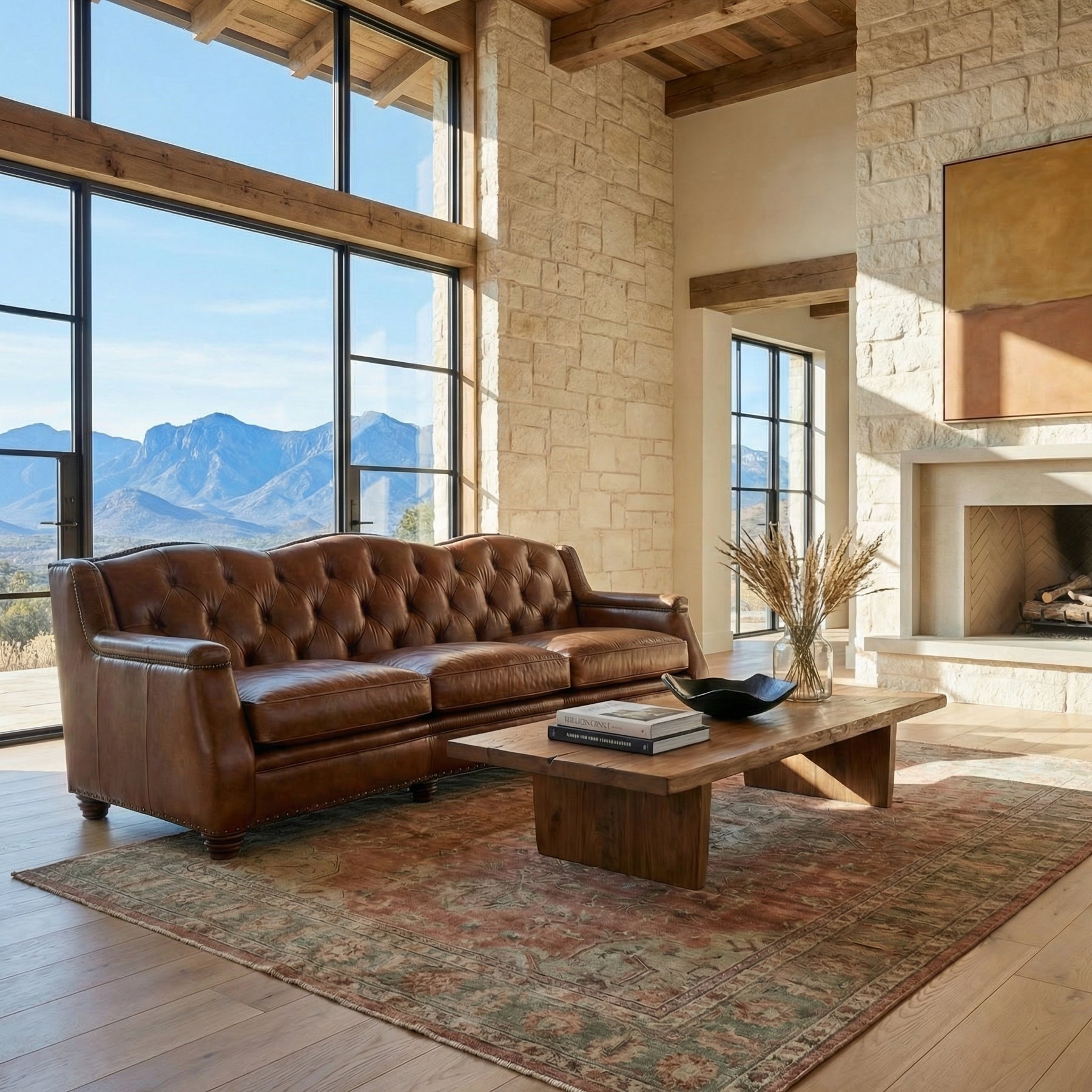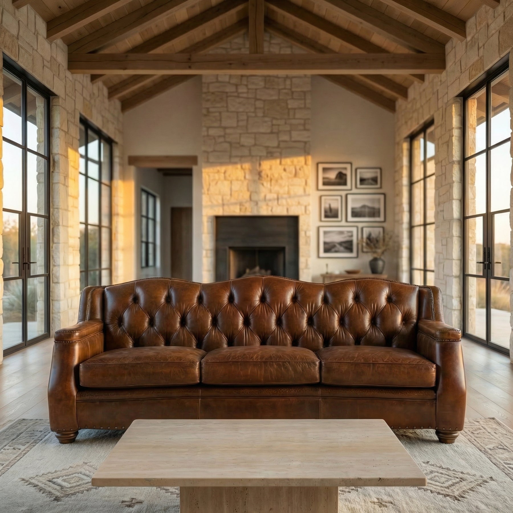 Make a bold statement of Western sophistication with the Nevada Conversation Sofa — a beautifully curved design that invites both comfort and conversation. Upholstered in hand-finished top-grain leather with a warm, distressed patina, this sofa features deep diamond tufting across the backrest, a camelback silhouette, and hand-applied nailhead trim. The sculpted front rail, plush seat cushions, and turned wood feet add to its refined rustic appeal, making it a standout centerpiece in any lodge, ranch, or upscale living room.
