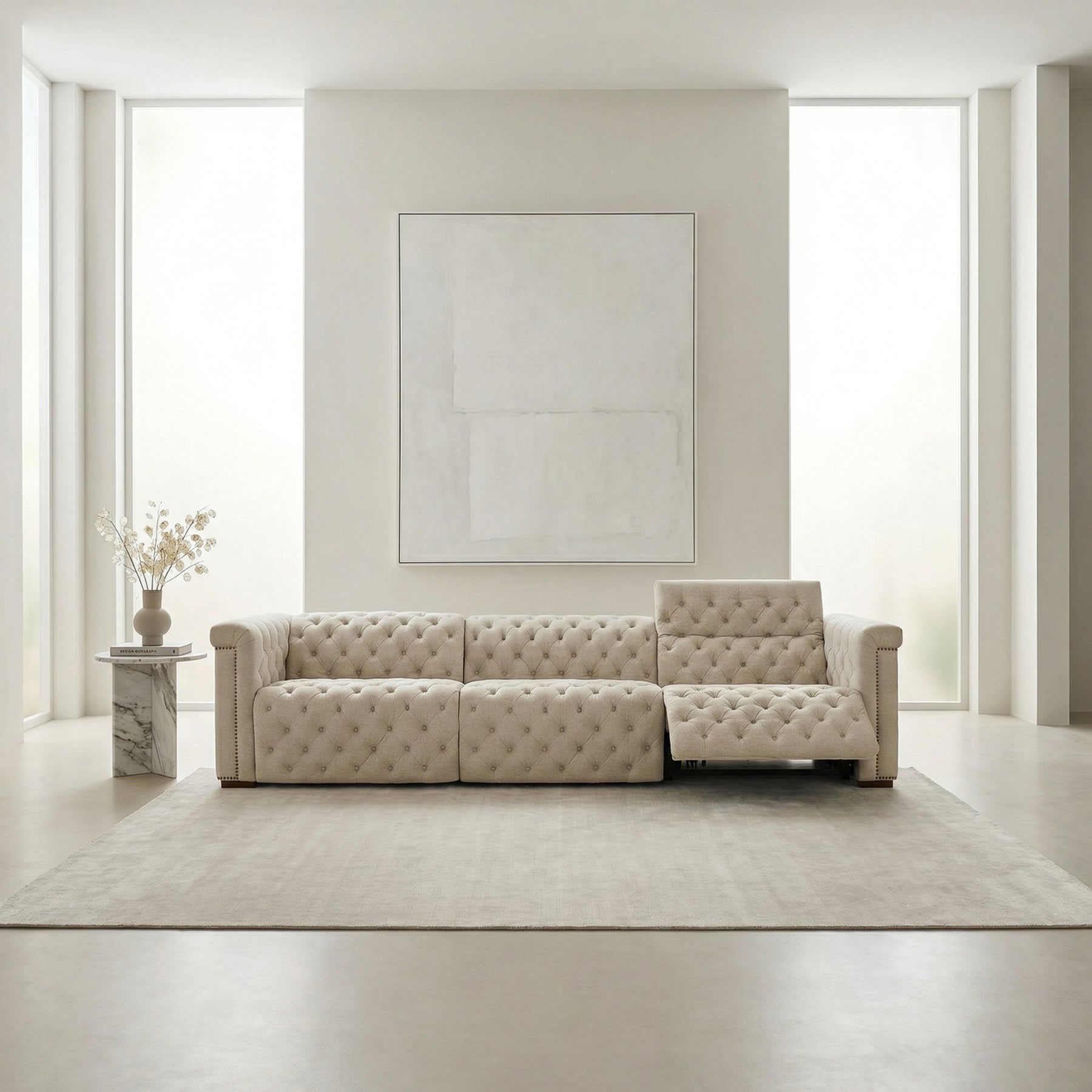 Experience refined comfort with the Chesterfield Luxe Power Reclining Sofa, featuring dual power recliners and three adjustable power headrests for customized relaxation. Upholstered in durable Aries Beach performance fabric, this sofa blends classic Chesterfield tufting with dark wood accents and copper-toned nailhead trim for a sophisticated look. Discreet power mechanisms add modern functionality, making it a stylish and luxurious centerpiece for any living room.