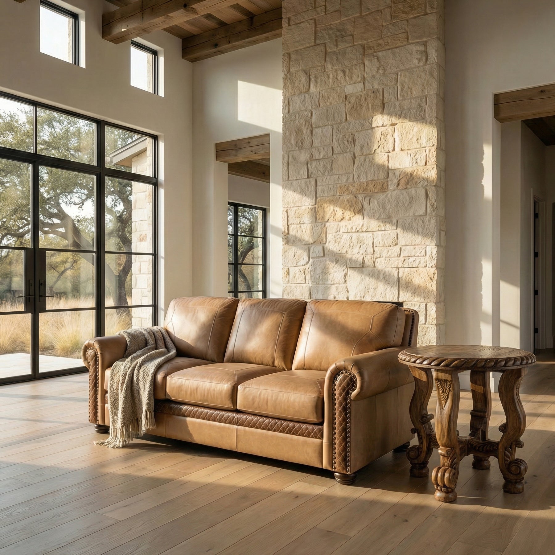 The Diamond Stitch Sofa is a refined blend of Western elegance and upscale craftsmanship. Wrapped in smooth, top-grain leather, this sofa stands out with its signature diamond-stitched leather accents along the arms and lower front rail—adding depth, texture, and a custom designer feel. The rolled arms, hand-applied nailhead trim, and plush cushions create a perfect balance of comfort and luxury, making this piece ideal for ranch-inspired homes, transitional spaces, and refined living rooms.