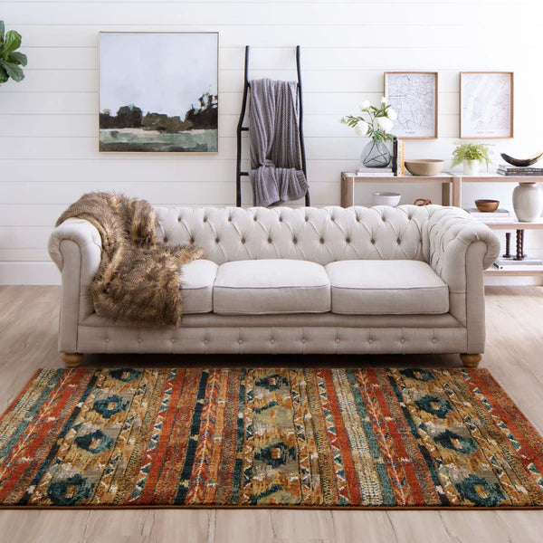 Bring a bold and timeless touch to your space with the Spice Market Infused Aquamarine Rug. Featuring a rich palette of rustic reds, golden mustards, deep teals, and earthy browns, this rug draws inspiration from classic global patterns and traditional textiles. The dynamic design showcases layered geometric motifs and ikat-inspired accents, creating a statement piece that complements both contemporary and rustic décor.