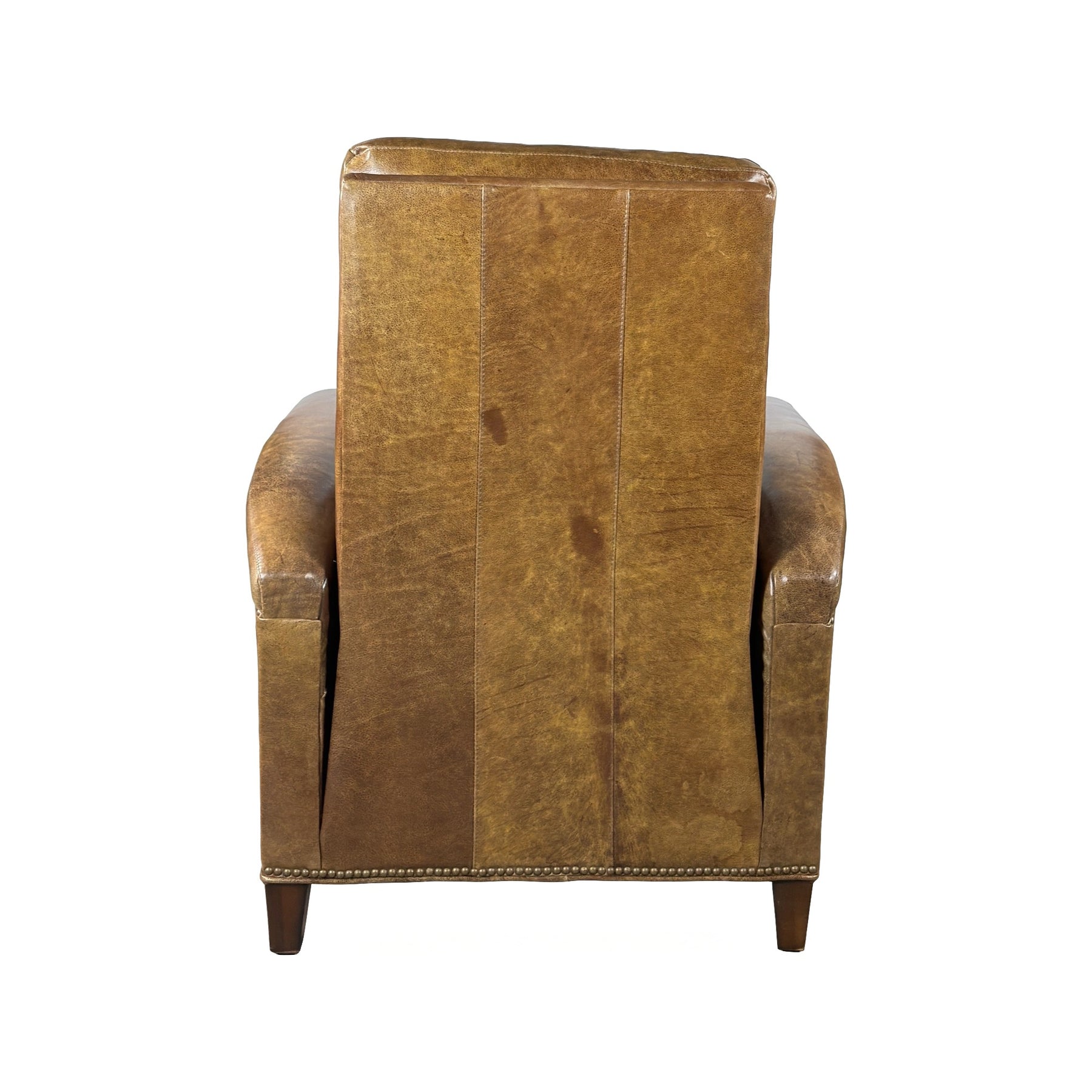 The Saddle Ridge Recliner embodies relaxed Western luxury with a modern edge. Wrapped in top-grain leather with a rich, saddle-toned patina, this chair brings warmth and character to any room. Its clean lines and squared arms offer a refined, transitional look, while the hand-applied nailhead trim and tapered wooden legs ground it in rustic craftsmanship. Designed for both comfort and style, the Saddle Ridge is perfect for ranch-inspired homes, mountain lodges, or sophisticated living spaces.