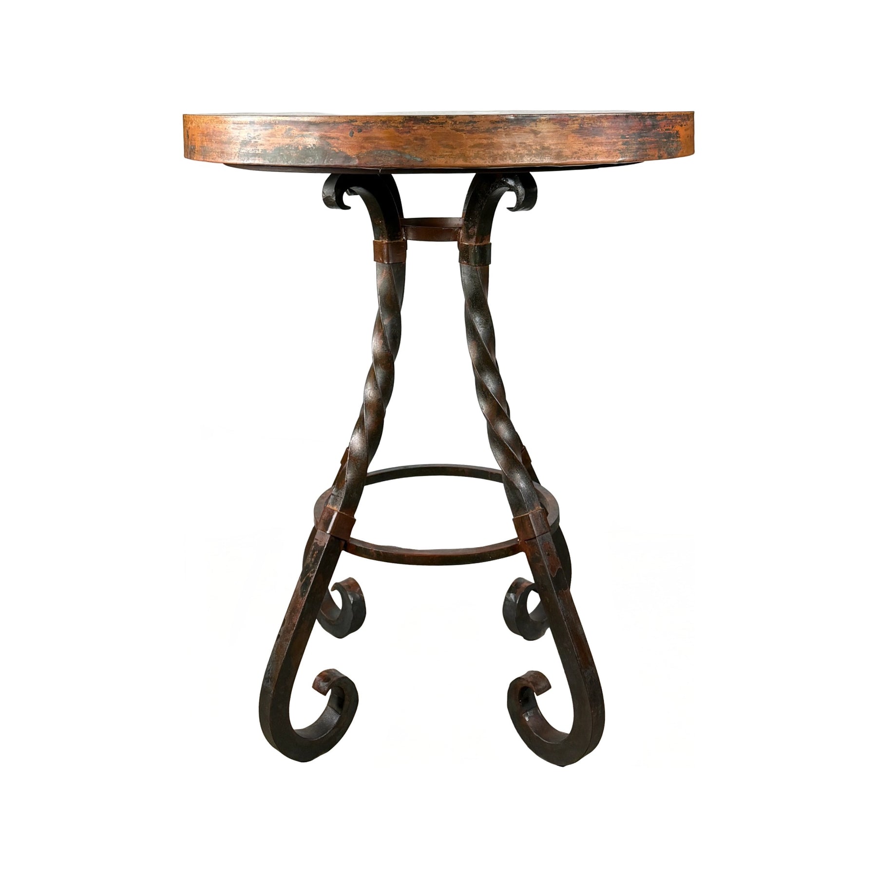 Add a touch of handcrafted elegance to your home or bar with the Copper Top w/ Sierra Iron Pub Base. This striking piece combines the warmth of genuine hand-hammered copper with the strength and artistry of the Sierra wrought-iron base. The copper top features rich patina tones that deepen over time, bringing character and depth to any setting, while the twisted and scrolled iron base offers both visual appeal and durability.