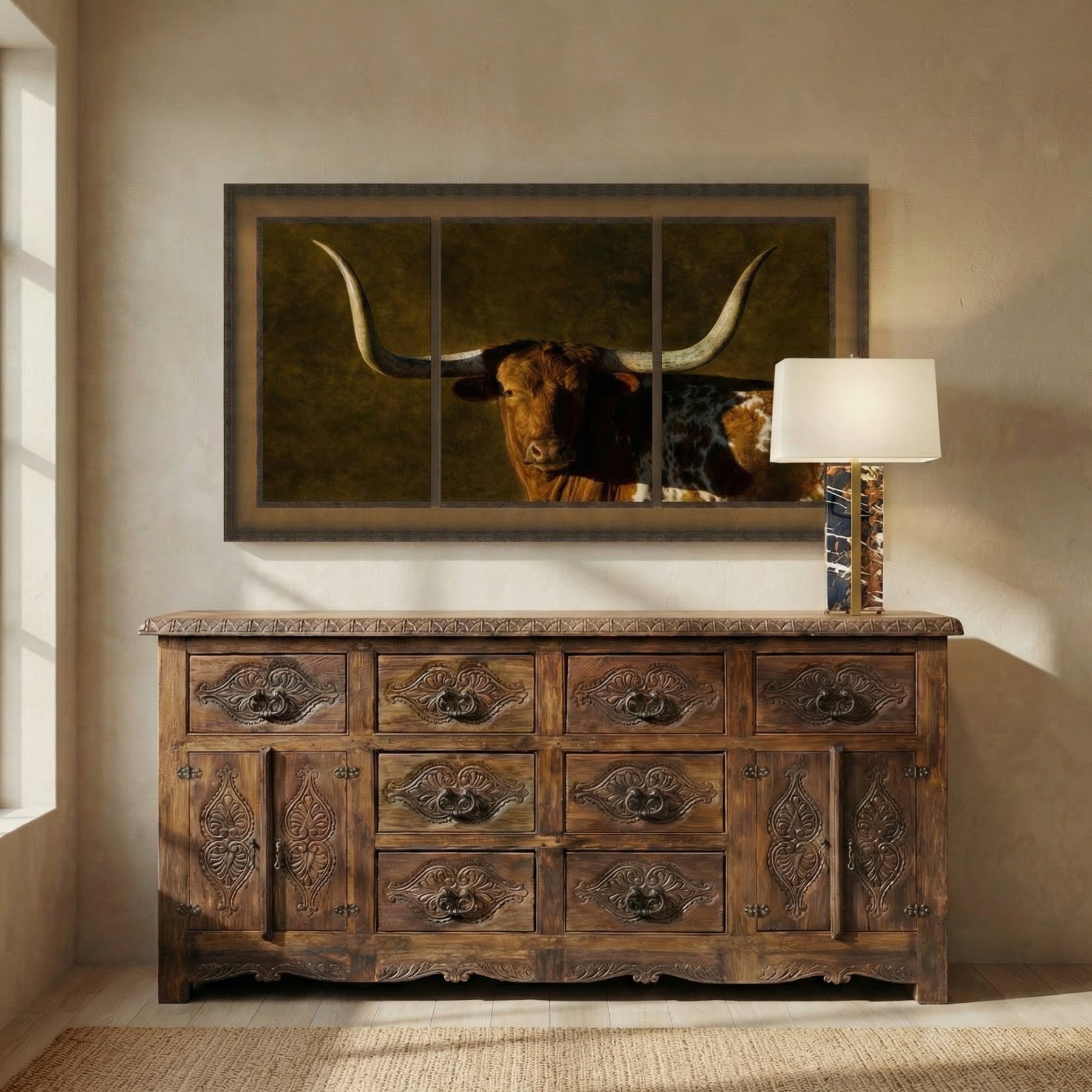 Celebrate the enduring spirit of the Lone Star State with Texas Triptych Art, a striking portrait of a majestic longhorn captured in dramatic light and shadow. Set against a rustic, golden backdrop, this bold composition is divided into three vertical panels, adding a modern twist to a timeless Western subject. The longhorn's expansive horns command attention while its steady gaze evokes strength, resilience, and pride.